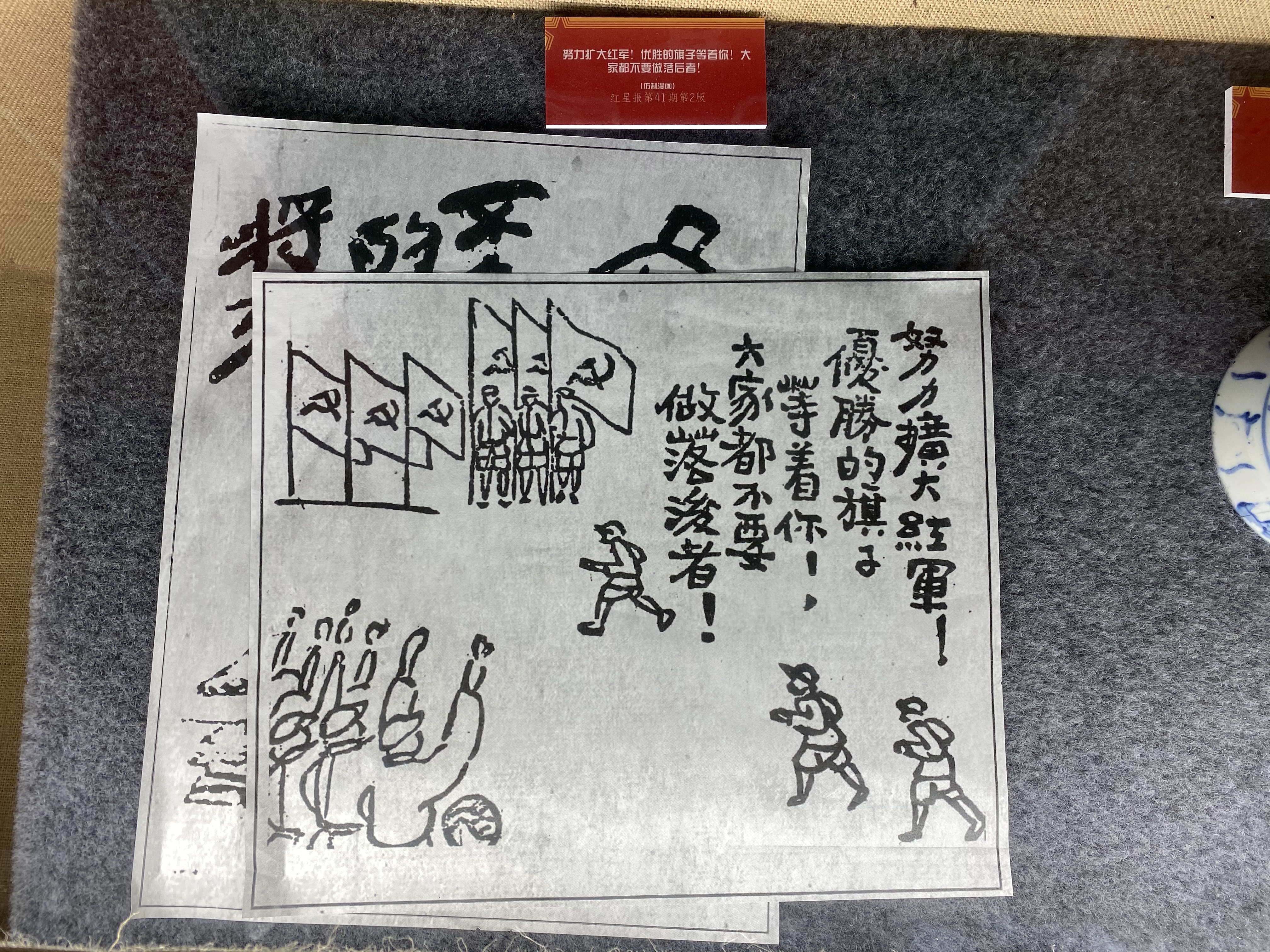 馆内的展示柜里保存有不少战时漫画(仿制)。“例如这副写着‘努力扩大红军!优胜的旗子等着你!大家都不要做落后者!’字样的。当年,这幅漫画刊登在红星报上,激昂的口号,极大鼓舞了士气。”讲解员介绍。