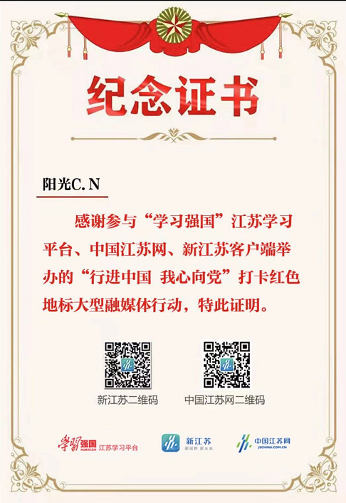 随后,蒋守洋使用中国江苏网、新江苏客户端制作的“行进中国 我心向党”打卡红色地标UGC小程序进行线上打卡,领取纪念证书。