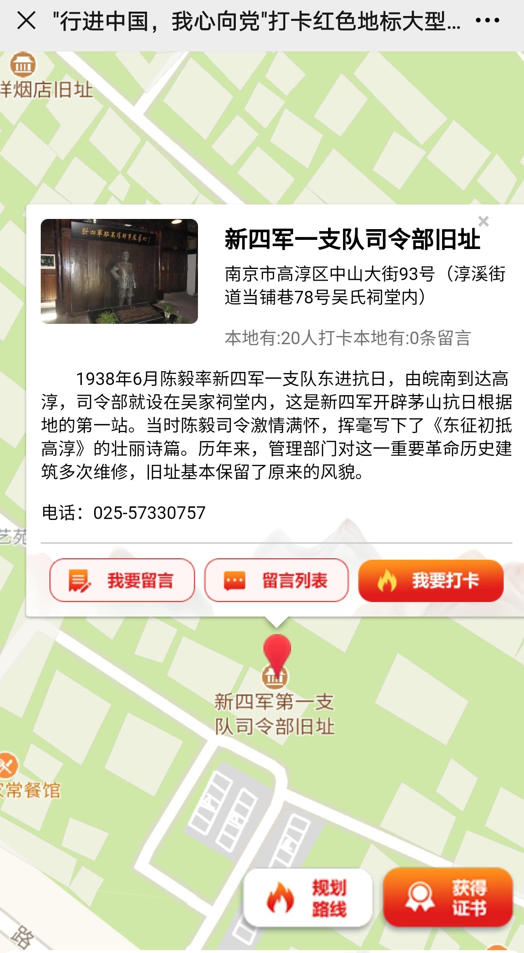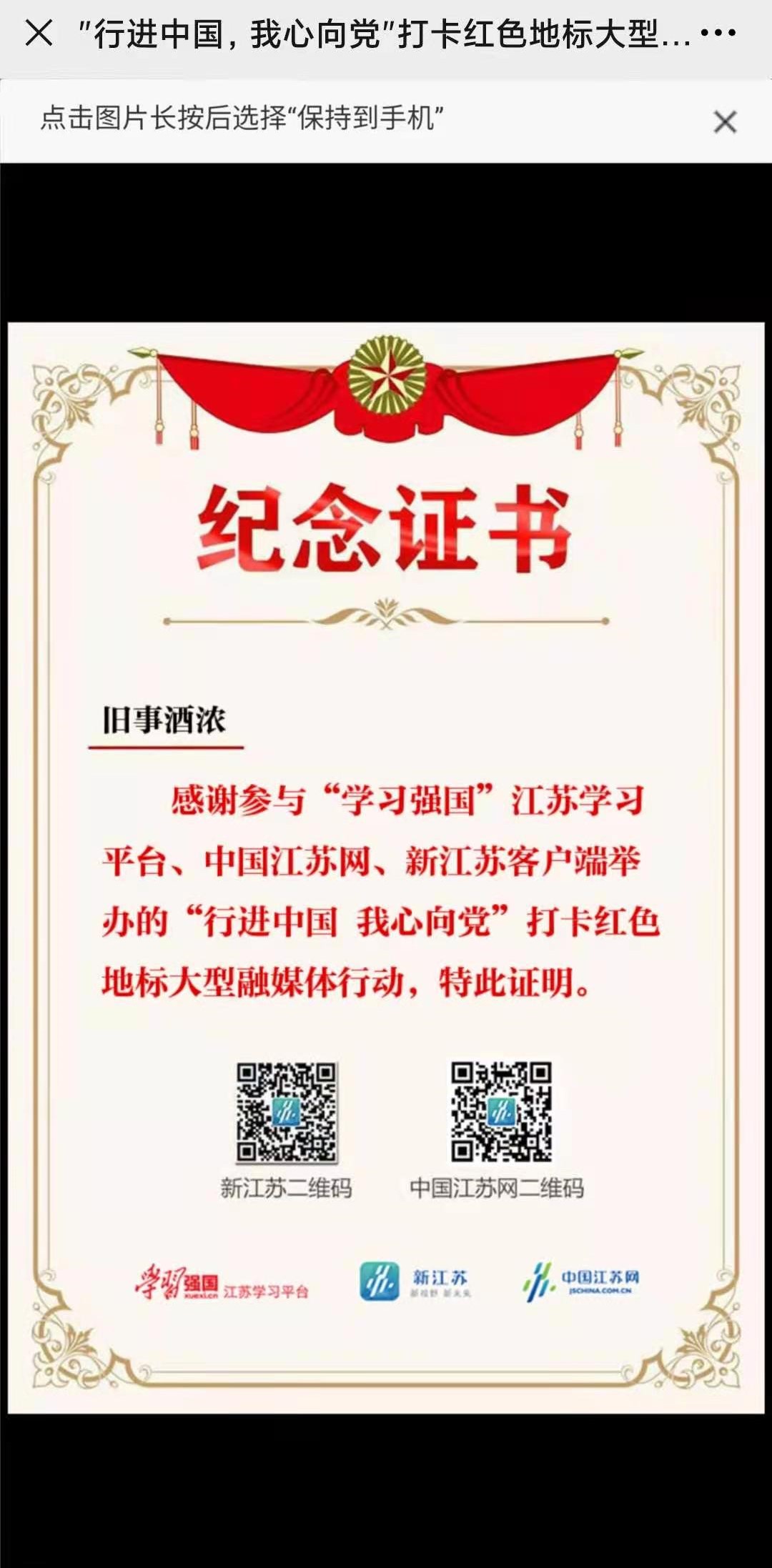 参观完毕,孙芮成和同行的朋友使用中国江苏网·新江苏客户端制作的“行进中国我心向党”打卡红色地标UGC小程序线上打卡,在互联网上留下自己的红色“电子足迹”。革命精神永不褪色,红色记忆历久弥新。1938年星夜到访高淳的新四军第一支队,将一粒粒红色种子播种在了百姓心田。