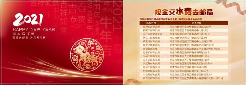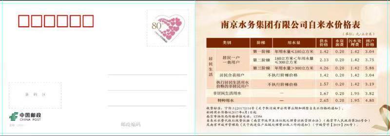 虽然南京水务集团有限公司抄收管理所城南交费网点已于去年撤除,但目前59家南京城区邮政网点均可以办理代缴水费业务,其中有6个试点网点投放了宣传广告并提供缴纳水费赠送明信片服务。“一些老年人由于年龄和身体上的原因,即便经过培训,也很难掌握新技术。我们在拥抱信息化的同时,确实应该充分考虑他们的特殊情况。”集邮与文化传媒部经理曾伟介绍道。用户在其中6个试点的网点缴纳水费后还可获赠一张明信片,主片为牛年新年祝福,附片为水费标准和部分缴费网点地址,便于老年用户保存和查看。
