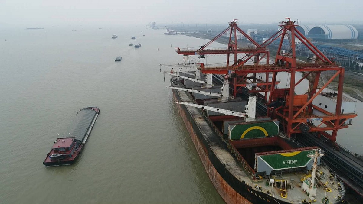 宽阔的江面波光粼粼,随着电机的运行,煤炭被源源不断输送到货轮上,然后依托长江黄金水道,被运到全国各地。