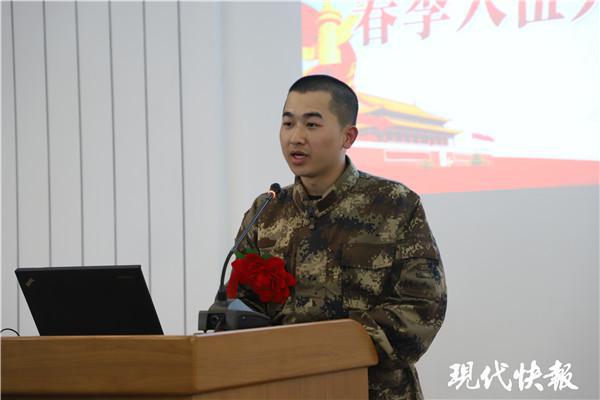 △ 秦维贤作为 15 名春季入伍大学生代表发言