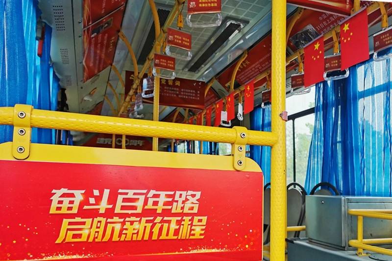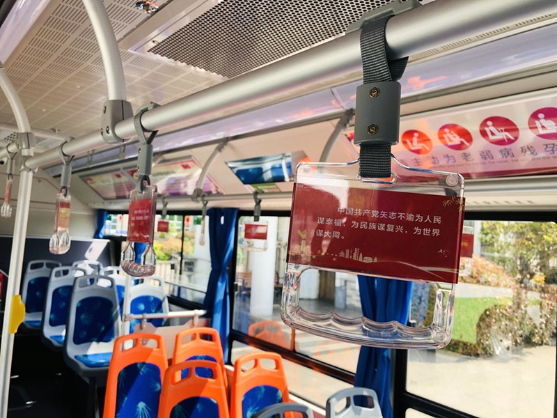 在徐州邳州30路公交车上,记者看到,车厢内“中国梦”“讲好中国故事”等标语错落分布在车厢两侧宣传栏内,站点示意图、手拉环等位置也都有庆祝建党100周年的红色标语。乘客张子安是一名高中生,他告诉记者:“以前坐公交车,我都是看手机打发时间,现在可以浏览、了解党史,从中汲取精神养分,丰富了我的知识,我体会到革命先辈为中华民族解放事业作出的巨大贡献。”看着一幅幅红色宣传标语,市民王先生觉得如今的美好生活来之不易:“共产党奋斗了这么多年,才有了我们现在的幸福生活,这样的宣传方式,让我们可以牢牢记住党的历史,并流传下去。”