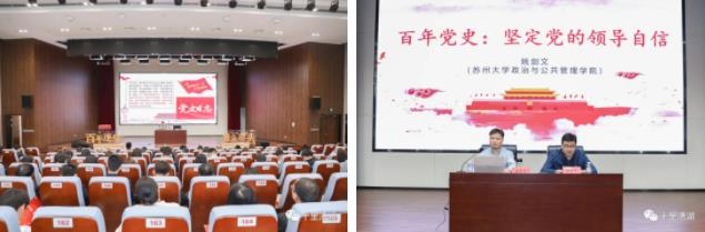 用好高校专家资源,与苏州大学政治与公共管理学院开展党建共建,思政学专家姚剑文以《百年党史:坚定党的领导自信》为题为街道班子成员、机关干部和村社区主要负责同志授课。