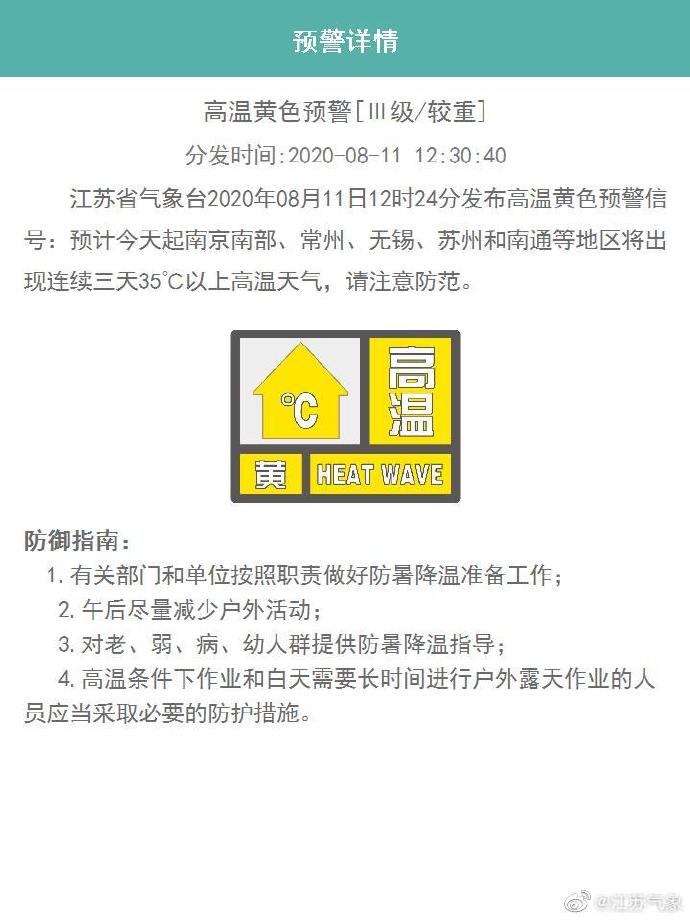 江苏省气象台2020年08月11日12时24分发布高温黄色...