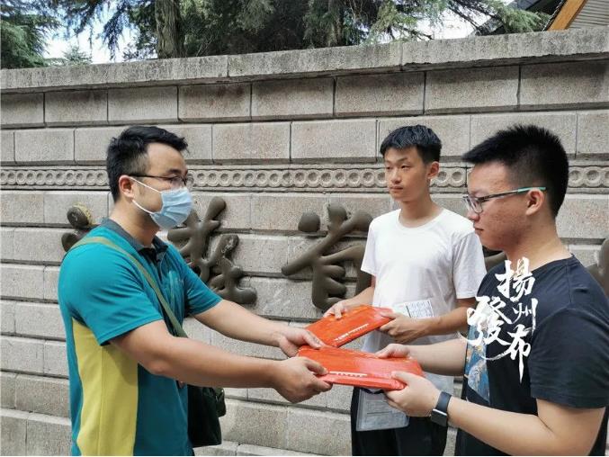 上午9:30,记者跟随扬州邮政特快专递工作人员来到投递地点扬州中学 。武承翰、史开源同学和家长已早早等候在那里。
