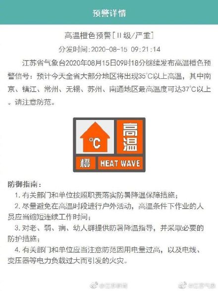 江苏省气象台2020年08月15日09时18分继续发布高温橙色预警信号,请注意防范。