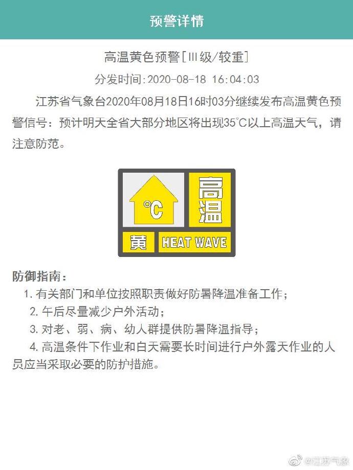 江苏省气象台2020年08月18日16时03分继续发布高温黄色预警信号:预计明天全省大部分地区将出现35℃以上高温天气,请注意防范。