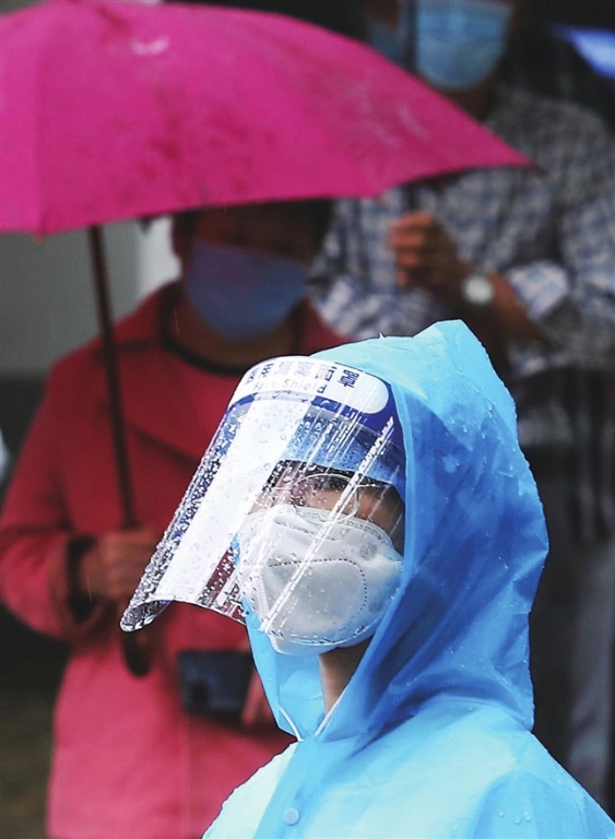 昨天,苏州市多地继续开展区域核酸检测,广大志愿者在雨中坚守岗位,用行动助力苏城筑牢抗疫防线。