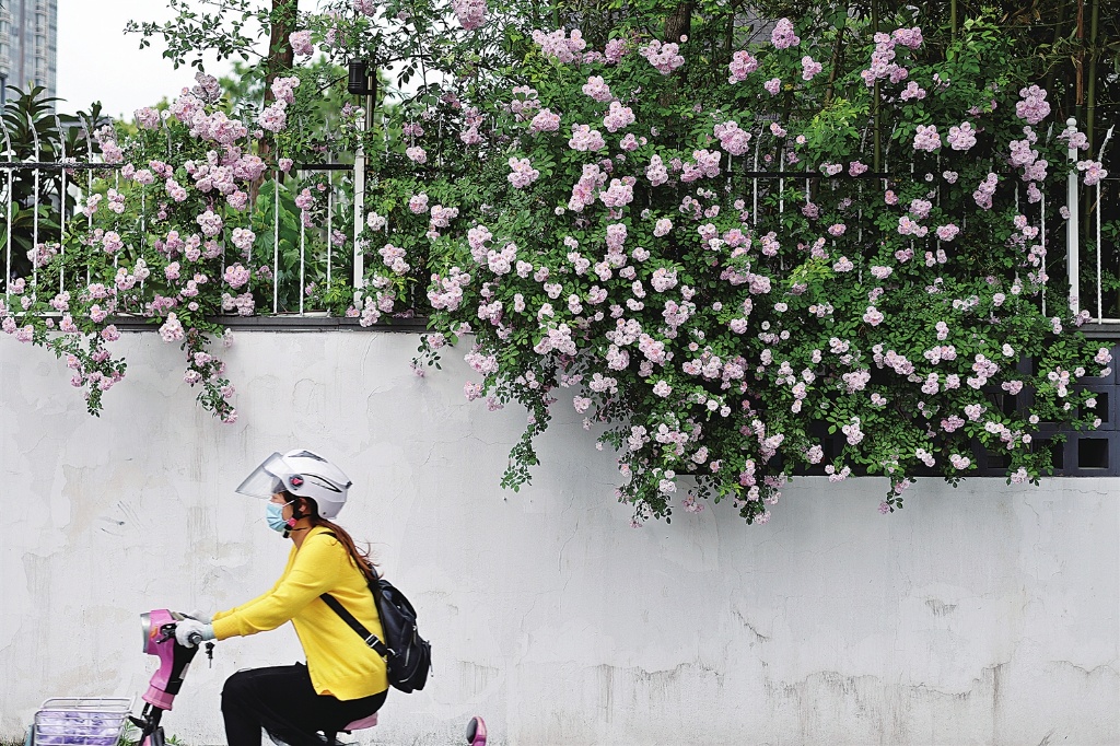 昨天,在姑苏区现代花园里城湾街,居民栽种的蔷薇花藤蔓延至墙外,路过的行人不经意间邂逅一片粉色浪漫。