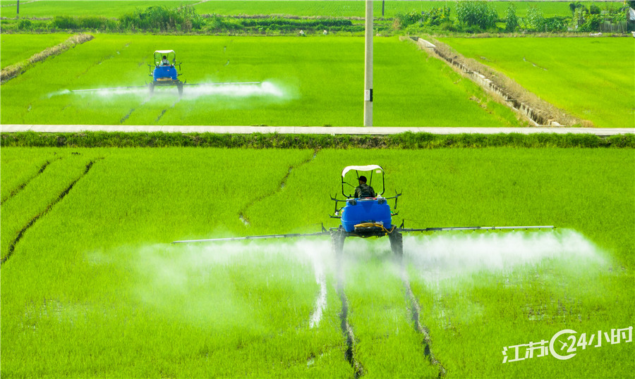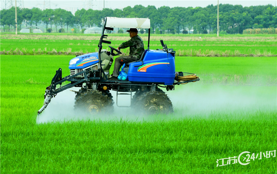 当前,太仓市种植的17.5万亩水稻进入生长拔节期,当地农民抢抓农时,做好稻田的除草、施肥、洒药等田间管理,为秋粮丰产丰收打下基础。
