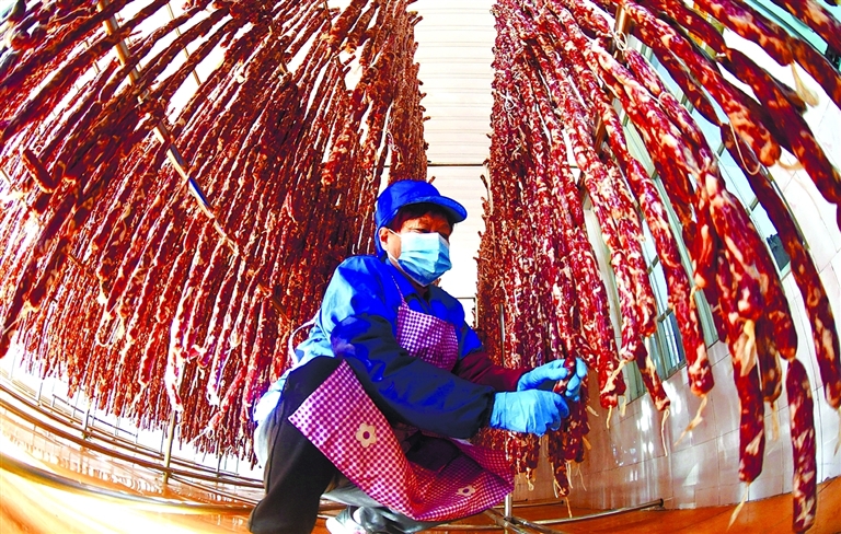 昨日,在海州区板浦镇一家肉制品厂,工人们采用已经延续近200年的传统工艺加紧进行灌装、风干、包装香肠,及时供应市场,满足客户需求。