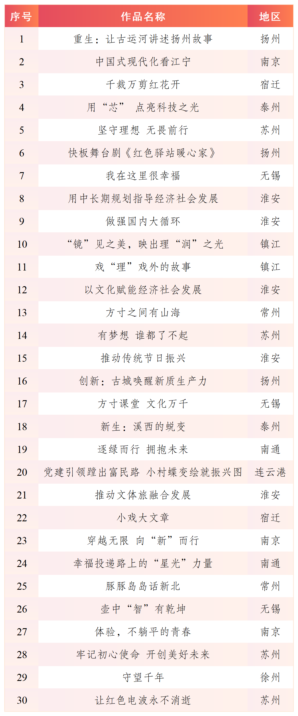 据悉,此次推出的入围作品,将在“江苏理论宣讲共建共享平台”“学习强国”江苏学习平台、交汇点新闻客户端等平台集中展播,方便广大群众在线观看、学习交流,让党的创新理论在更广阔的范围内落地生根、深入人心。