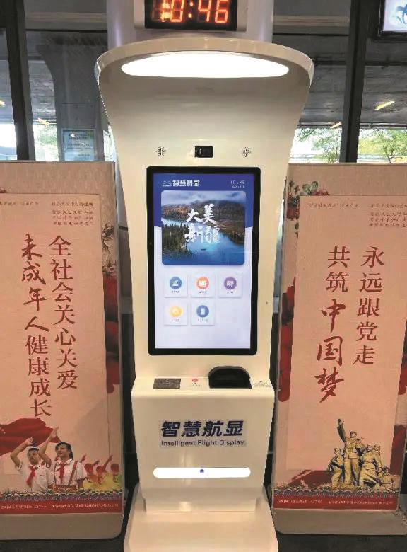 首批4台“全自助、零接触”新一代智慧航显设置在安检待检区域入口、旅客候机区及旅客到达大厅等。航显设备顶部显示时间,中部是一块大屏幕,旅客通过自助值机或在柜台办理值机手续后,可在智慧航显上通过“刷脸”或刷身份证进行查询,系统会自动提供航班和登机口信息,并精准测算从当前位置到达登机口的路径,为旅客提供针对性线路指导服务。