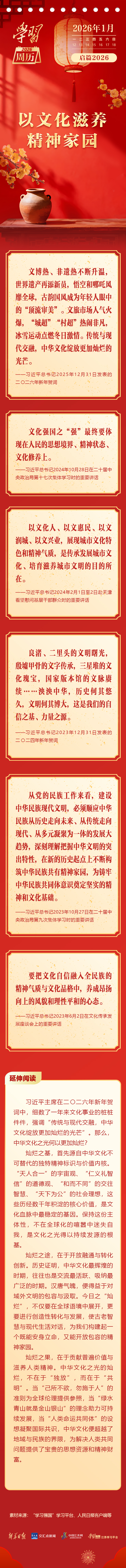 岁序更替,时间的况味中,交织着过去与未来的遐思,也沉潜着文化的深沉脉搏。习近平主席在二〇二六年新年贺词中,指出“我们以文化滋养精神家园”“传统与现代交融,中华文化绽放更加灿烂的光芒”。岁启新篇,让我们一起跟随主席探寻这份深厚的文化情怀,感悟这种“更基础、更广泛、更深厚的自信”力量。