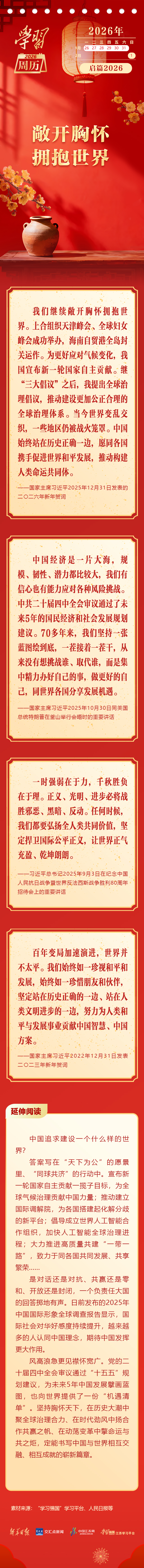 “我们继续敞开胸怀拥抱世界”“中国始终站在历史正确一边,愿同各国携手促进世界和平发展,推动构建人类命运共同体”。百年变局加速演进,习近平主席发表的新年贺词中,计利天下的情怀、合作共赢的格局,传递着鲜明的中国主张、为世界发展注入中国信心。本期一起感悟和平发展的坚定信念与开放共赢的大国气度。