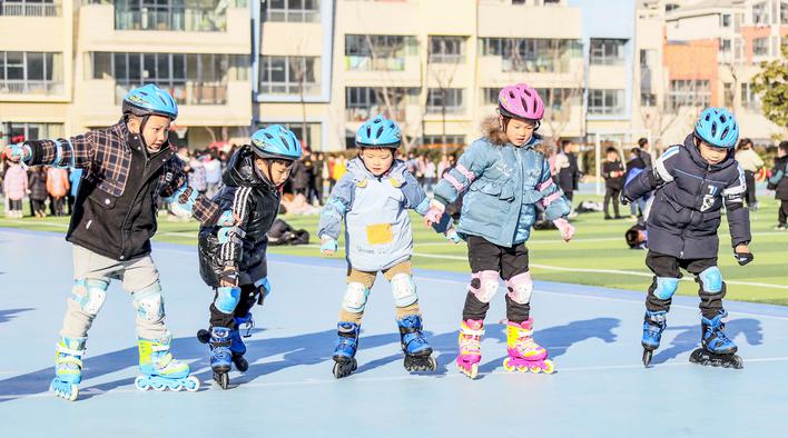 连日来,淮安市多所小学在大课间开展轮滑、跳绳、韵律操、打球等多项体育活动,吸引小学生积极运动,锻炼身体,抵御寒冷。