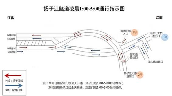 南京扬子江隧道全年无休,采取南线、北线按日期单双号交替夜间封闭管养方式。单号日期南线全天开通、北线夜间封闭保修保洁,双号日期北线全天开通、南线夜间封闭保修保洁;夜间封闭时间为1:00至5:00。