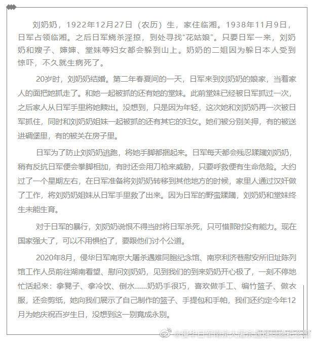 我们悲痛地获悉,日军“慰安妇”性暴力制度受害者刘奶奶,于2020年11月22日上午11时去世,享年100岁。截至目前,经认证在世的“慰安妇”性暴力制度受害者已不足20位。今年8月,侵华日军南京大屠杀遇难同胞纪念馆工作人员曾前往湖南看望老人,还约定今年12月为老人庆祝百岁生日,不想这一别竟成永别。愿老人安息!转发送别,勿忘历史!