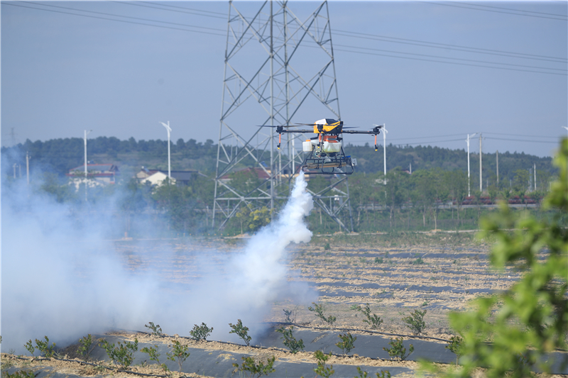 (5G无人机在溧水数字农场喷洒药剂。)