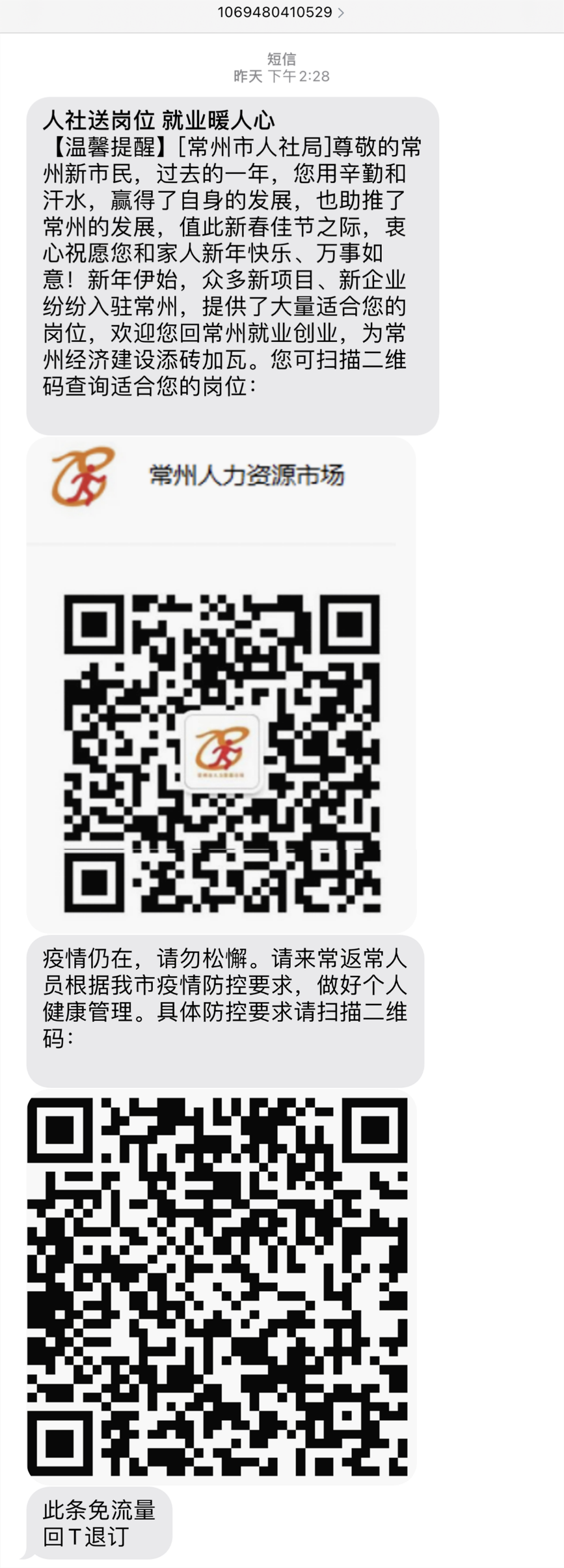 “尊敬的常州新市民……新年伊始,众多新项目、新企业纷纷入驻常州,提供了大量适合您的岗位,欢迎您回常州就业创业……”最近,常州移动依托大数据技术优势,助力常州市人社局向5万余名未返常外来务工人员发送了一封“燃信”,力促“归雁回巢”,同时附上“常州市人力资源市场”网站二维码、防疫二维码,方便他们随时随地查询最新岗位信息,了解常州市当前疫情防控要求。