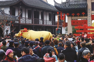 图为游客在周庄体验“摸春牛”民俗活动。朱雄杰摄