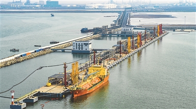 连云港徐圩港区利用填海造田工程打造广袤土地,按照绿色、生态、智能的发展理念,建设具有国际领先水平的绿色港口。图为徐圩港区的盛虹石化液体化工码头分外壮观。 新华报业视觉中心记者 宋 峤摄