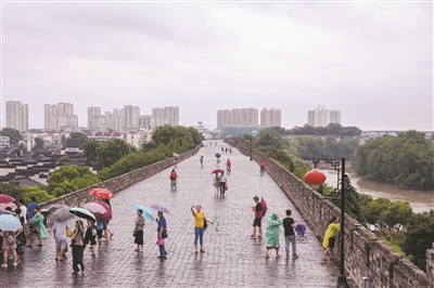 昨天,市民和游客雨中参观南京中华门城堡。贾建平 摄 视觉江苏网供图