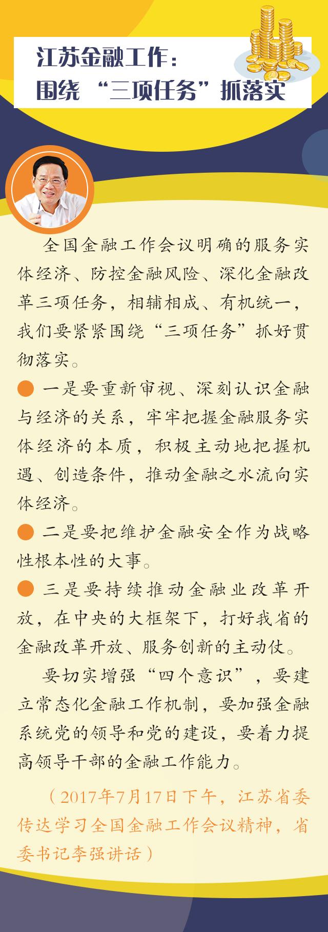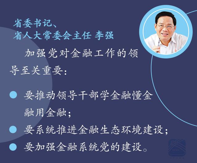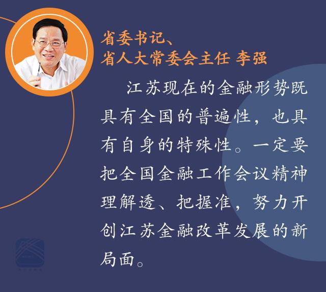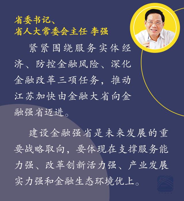 李强指出,当前和今后一个时期,做好全省金融工作,必须深入贯彻习近平总书记系列重要讲话精神和治国理政新理念新思想新战略,加强党对金融工作的领导,坚持稳中求进工作总基调,遵循金融发展规律,紧紧围绕服务实体经济、防控金融风险、深化金融改革三项任务,完善金融市场体系,推动金融产业转型升级,建立健全地方金融监管框架,加强金融人才队伍建设,优化金融生态,推动江苏加快由金融大省向金融强省迈进。建设金融强省是未来发展的重要战略取向,要体现在支撑服务能力强、改革创新活力强、产业发展实力强和金融生态环境优上。