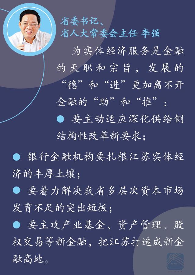 李强指出,为实体经济服务是金融的天职和宗旨,也是防范金融风险的根本举措。未来几年正值我省经济爬坡过坎、转型升级的关键时期,发展的“稳”和“进”更加离不开金融的“助”和“推”。要主动适应深化供给侧结构性改革新要求,树立质量优先、效率至上的理念,在服务实体经济中实现经济发展和金融业发展的“双赢”。银行金融机构要扎根江苏实体经济的丰厚土壤,把更多金融资源配置到经济社会发展的重点领域和薄弱环节,满足经济发展中多样化的金融需求。要着力解决我省多层次资本市场发育不足的突出短板,抓住机遇鼓励和引导企业加快建立现代法人治理结构,积极上市进入资本市场发展,稳妥推动省内区域性股权交易中心整合和规范发展,积极培育私募股权投资市场,鼓励有条件地区开展各类私募基金集聚区建设,鼓励保险机构开展更多契合江苏经济发展热点难点痛点的险种创新,鼓励保险资金积极参与到我省重大工程和重大产业项目建设中来。要主攻产业基金、资产管理、股权交易等以金融与产业深度融合为特色的新金融,把江苏打造成新金融高地。