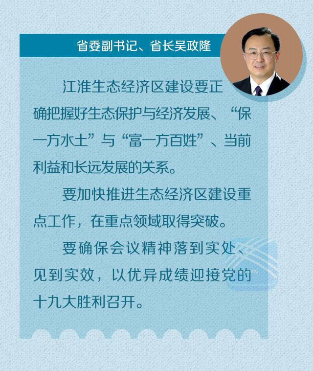 吴政隆就贯彻落实好会议精神特别是李强书记讲话精神提出要求。他强调,江淮生态经济区建设事关全省发展大局和长远,要切实增强责任感和使命感,把思想认识统一到省委、省政府决策部署上来,正确把握好生态保护与经济发展、“保一方水土”与“富一方百姓”、当前利益和长远发展的关系;要加快推进生态经济区建设重点工作,在加强生态环境保护、推动生态经济发展、构建精致宜人绿色城乡、打好富民增收主攻仗、强化政策支持保障等重点领域取得突破;要树立一体化理念、增强“一盘棋”意识,加強规划引领,鼓励先行先试,上下联动、左右协同,主动作为、积极作为,确保会议精神落到实处、见到实效,以优异成绩迎接党的十九大胜利召开。