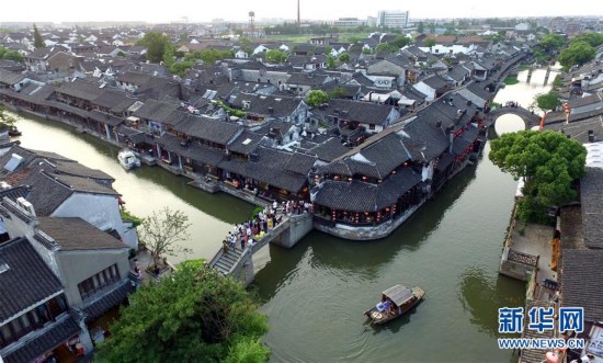 这是2017年6月2日航拍的浙江省嘉善县的西塘古镇。嘉善县位于浙江省嘉兴市东北部,江浙沪两省一市交汇处,地处长三角城市群核心区域,全县面积500多平方公里,是全国首个县域科学发展示范点。2016年,嘉善实现地区生产总值457亿元,位居全国县域前列。目前,嘉善已经全面消除人均年收入4600元以下贫困户,2016年城乡居民人均可支配收入分别为50021元和29514元。新华社记者 王定昶 摄