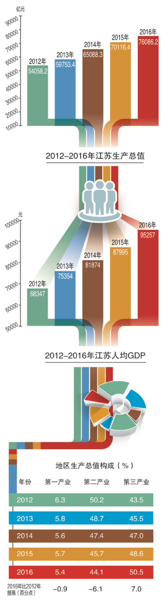 2012年—2016年,江苏生产总值年均增长8.6%,高于全国平均增速1.4个百分点。人均GDP去年达到95257元,居各省区之首。