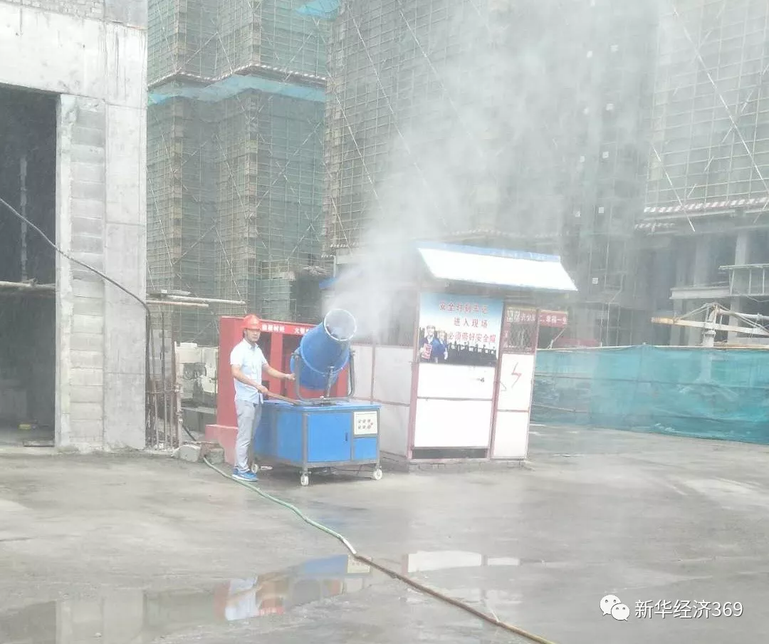 淮安市建筑工人用高炮进行洒水作业,降低扬尘污染。