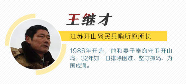 事迹简介:王继才,男,汉族,中共党员,1960年4月生,2018年7月去世,江苏灌云人,江苏开山岛民兵哨所原所长、燕尾镇开山岛村原党支部书记。1986年开始,他和妻子奉命守卫开山岛,32年如一日排除困难、坚守孤岛、为国戍海,自己动手修缮营房、建设哨所,坚持每天巡海岛、护航标、写日志,坚决与走私、偷渡等不法分子作斗争,有力捍卫了国家利益,把人生最美好的年华无私奉献给国防和海防事业。荣获“全国优秀共产党员”“全国爱国拥军模范”等称号。