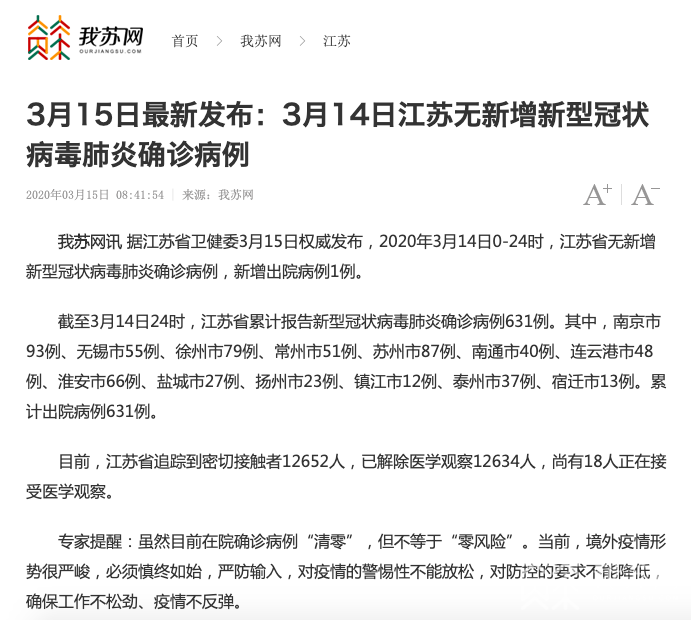 官宣:“动态清零”!刚刚(3月15日上午8时40分),江苏省卫健委发布:3月14日0时-24时,江苏省无新增新型冠状病毒肺炎确诊病例,新增出院病例1例,累计出院病例631例,尚有18人正在接受医学观察。目前,江苏省在院确诊病例“清零”。