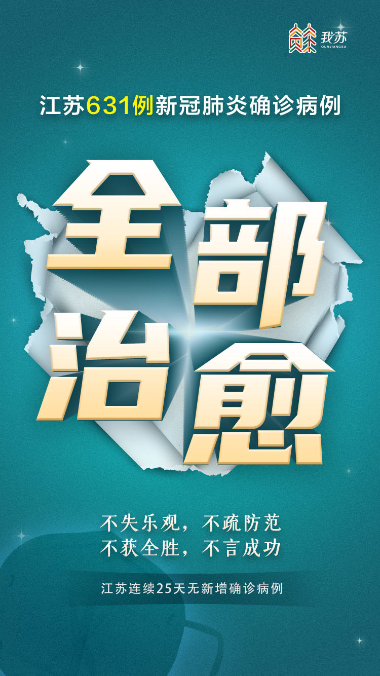 这也意味着,江苏已确诊的631例新冠肺炎患者全部治愈,实现了治愈率100%,确诊病例“零死亡”的目标。