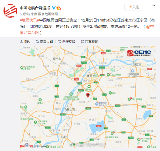 中国地震台网正式测定:12月25日17时54分在江苏南京市江宁区(有感)(北纬31.82度,东经118.76度)发生2.7级地震,震源深度12千米。