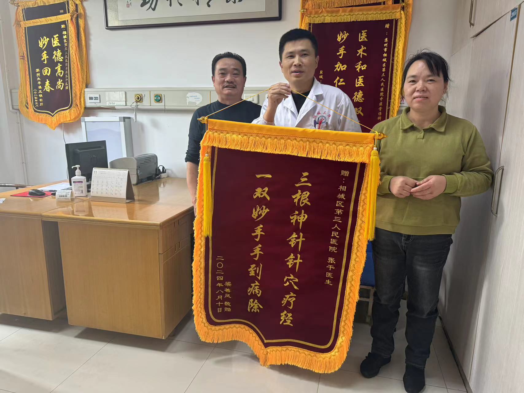 近日,梁女士夫妇将一面印有“三根神针针穴疗经,一双妙手手到病除”的锦旗送到了中医骨伤科张干医生手中,感谢他多次的用心治疗。