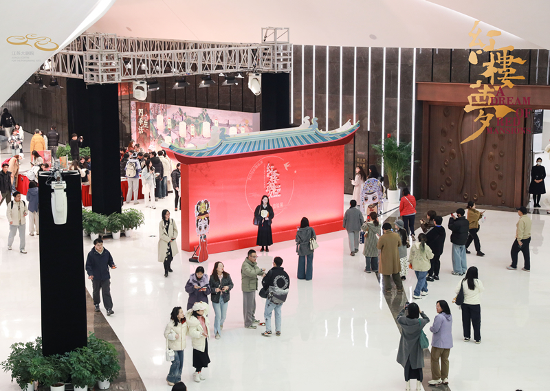 为了庆祝这一重要时刻,江苏大剧院还特别布置了“大观园”门头、红楼市集等场景,让观众在观演前就能感受到浓厚的文化氛围。同时,舞台实景、花葬的台阶与团圆的背景相映成趣,各色华美丝绸面料在灯光的照射下熠熠生辉,为观众带来了丰盈的“寻芳体验”。