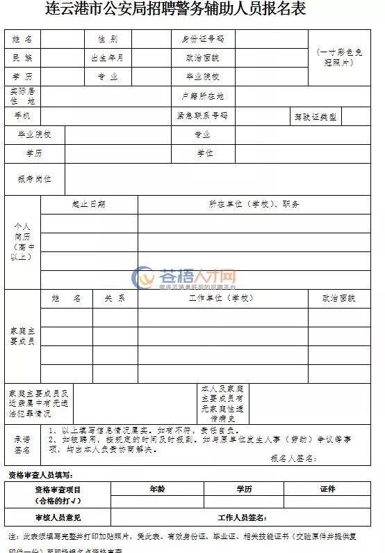 具体招聘岗位、人数、条件详见《连云港市公安局招聘警务辅助人员岗位简介表》(附件1)
