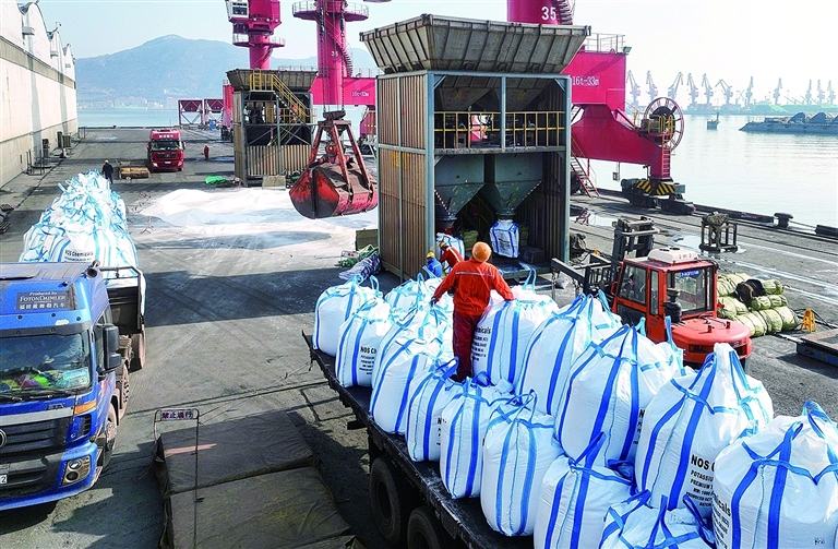 2月27日,码头工人在连云港港码头转运化肥。目前正处春耕时节,连云港港加大春耕化肥运输力度,设立农用物资“绿色通道”,对到港化肥采取“车船直取、船边验放”等便利措施,全力保障春耕备耕物资运输通畅、不误农时。记者王健民摄