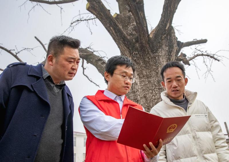 中国江苏网3月2日连云港讯 2月28日,连云港市东海县数据局五楼,东海县不动产登记中心为石榴街道浦西村村民委员会院内的一棵720岁的古银杏树颁发了林木所有权+集体建设用地使用权的不动产权证书。