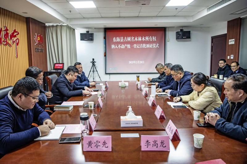 2月28日,东海县召开古树名木林木所有权纳入不动产统一登记首批颁证仪式,市县自然资源和规划局、县政府、有关乡镇村、科室负责人参加了会议。