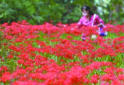 昨天,南京玄武湖公园翠洲的彼岸花竞相绽放,美不胜收,一片片火红的“花海”绘成一幅美丽的秋日画卷,吸引众多市民前来观赏、拍照。