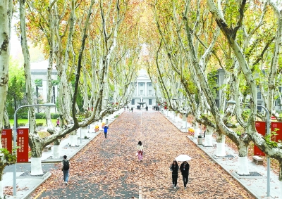 昨天,南京气温骤降,东南大学四牌楼校区主干道上的梧桐树叶纷纷落下,宛如油画一般令人陶醉。每年此时,这条主干道被师生们称为“东南大学最美200米”。