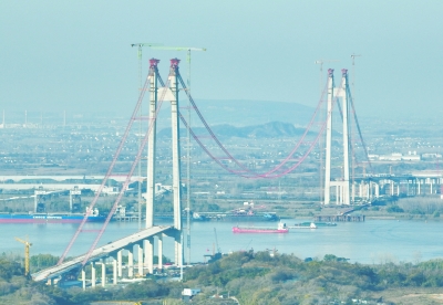 昨天,中交二航局承建的南京仙新路过江通道上部结构正在进行猫道门架安装施工,下一步将进行主缆架设施工。 南京日报/紫金山新闻记者 徐琦 摄