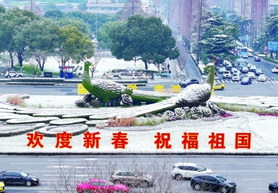 昨天,大雪过后的鼓楼广场孔雀绿雕银装素裹,美不胜收。“欢度新春 祝福祖国”的喜庆标语格外醒目。 南京日报/紫金山新闻记者 徐琦 摄