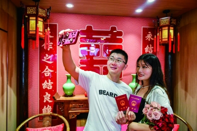 8月10日,七夕节恰逢周六,不少新人选择当天排队领证。图为在秦淮区民政局婚姻登记处夫子庙婚姻登记点(喜福馆)领证的新人。(相关报道见A3版) 南京日报/紫金山新闻记者 董家训 摄