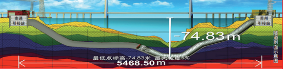 苏通GIL综合管廊是淮南-南京-上海工程的组成部分,位于苏通长江大桥上游1公里处,起于南岸(苏州)引接站,止于北岸(南通)引接站。隧道全长5468.5米,盾构直径12.07米,被誉为万里长江第一廊,也是全球第一次在重要输电通道中采用特高压GIL。管廊还预留了两回500千伏电缆区以及通信、有线电视等市政通用管线,可实现“一次建设,多次受益”。